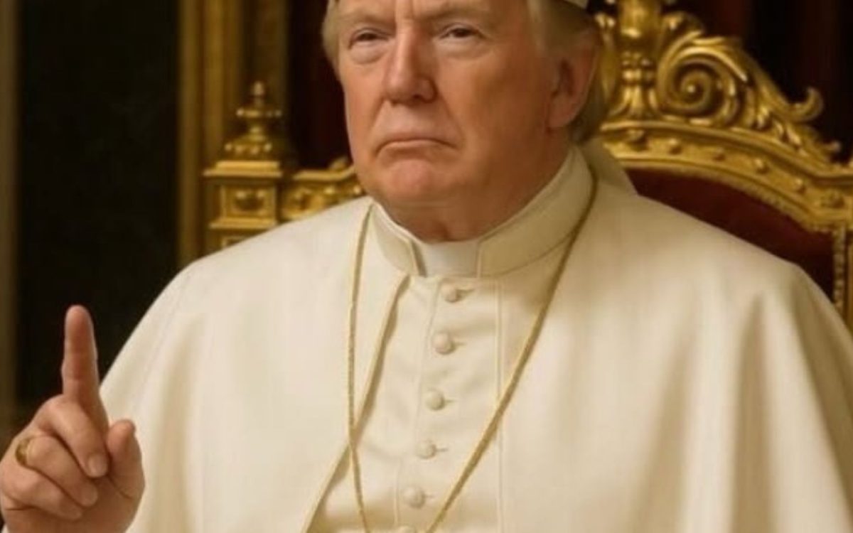 A imagem, gerada por inteligência artificial, mostra o ex-presidente Donald Trump vestido com trajes papais, sentado em uma cadeira ornamentada e com expressão solene, simulando a postura de um pontífice.