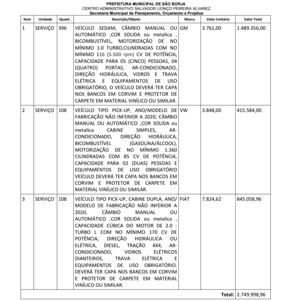 O contrato original prevê um investimento anual de até R$ 2.749.998,96 e inclui três tipos de veículos listados separadamente: