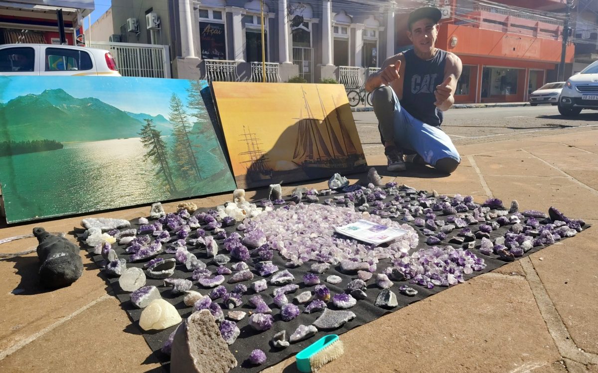 Está de passagem por São Borja, o artista de rua e vendedor ambulante Ezequiel Rodriguez, natural da cidade de Piriápolis no departamento de Maldonado, no Uruguai. Há mais de uma década vivendo nas estradas da América do Sul, ele percorre o Brasil oferecendo ametistas em estado bruto, originárias de Artigas, no norte uruguaio.